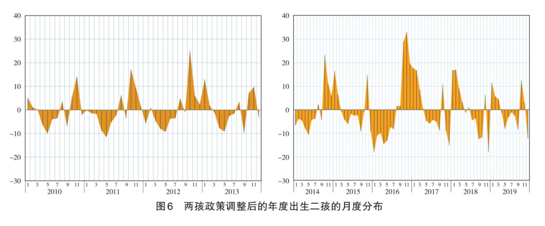 上述研究同时发现,2014年单独两孩政策、2016年全面两孩政策实施后,二孩出生的月度分布模式发生了明显变化。单独两孩政策实施后,2014年二孩出生高峰集中在10—12月,这三个月标准化后的出生人数比月平均多5.92%—23.27%,政策效应还持续到了2015年初。全面两孩政策实施后,2016年二孩更是高度集中在10—12月出生,这三个月标准化后的人数比月平均多19.59%—32.93%,且这种集中趋势延续到了2017年。