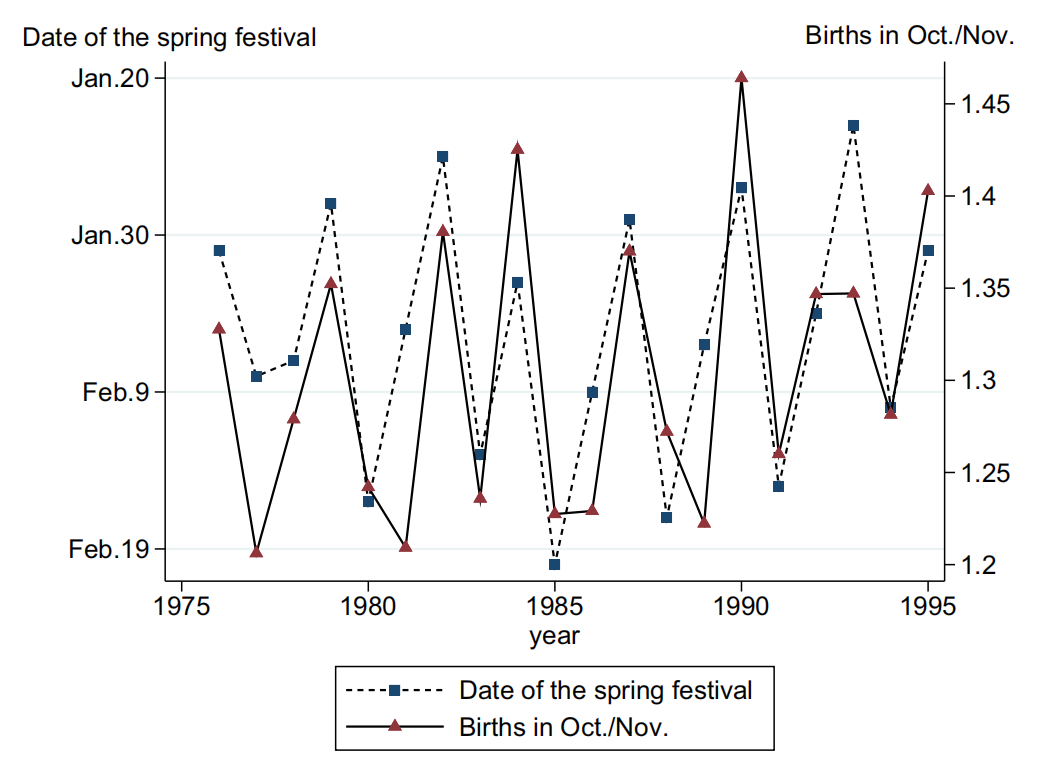 杨宇翔则在其论文中使用了The Spring Festival effect(春节效应)一词来概括其观点,他对城乡居民的行为动机做了不同区分:“目前的假设是,对于城市居民来说,春节是一个长假,让他们有足够的闲暇时间来受孕;同时,在农村地区,由于大量农村劳动力在城市工作赚钱,春节是他们回家与家人团聚的重要时刻,从而为他们创造了怀孕的机会。”