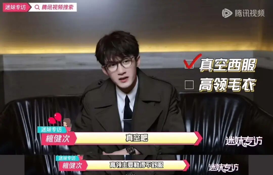 有明星曾表示自己不爱穿高领。一次快问快答中,檀健次在“真空西服”和“高领毛衣”里选择了前者,理由是高领勒得不舒服。